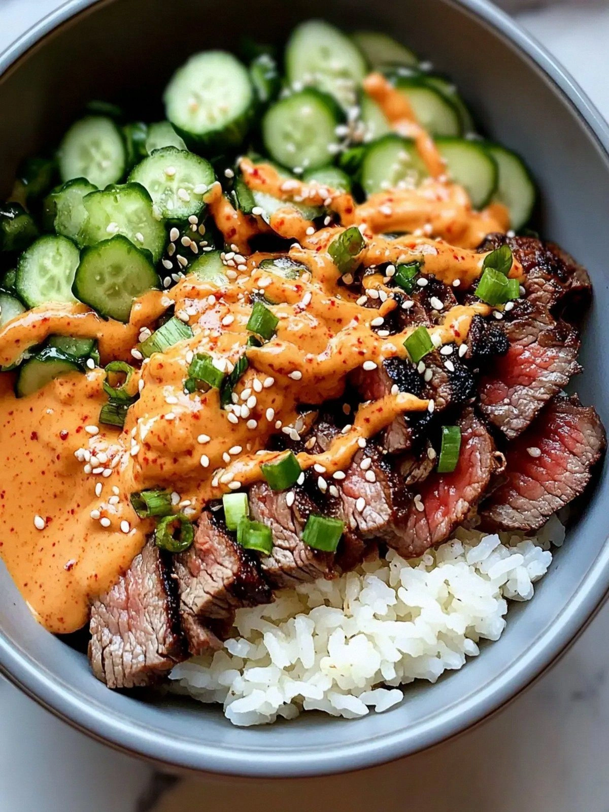 - Assemble the bowl: Spoon a generous portion of rice into each bowl. Top with seared steak, then arrange cucumber, carrot, kimchi, and green onions artfully. Drizzle the creamy sauce over the entire bowl, letting it cascade over the rice and meat. Sprinkle sesame seeds for a nutty crunch.