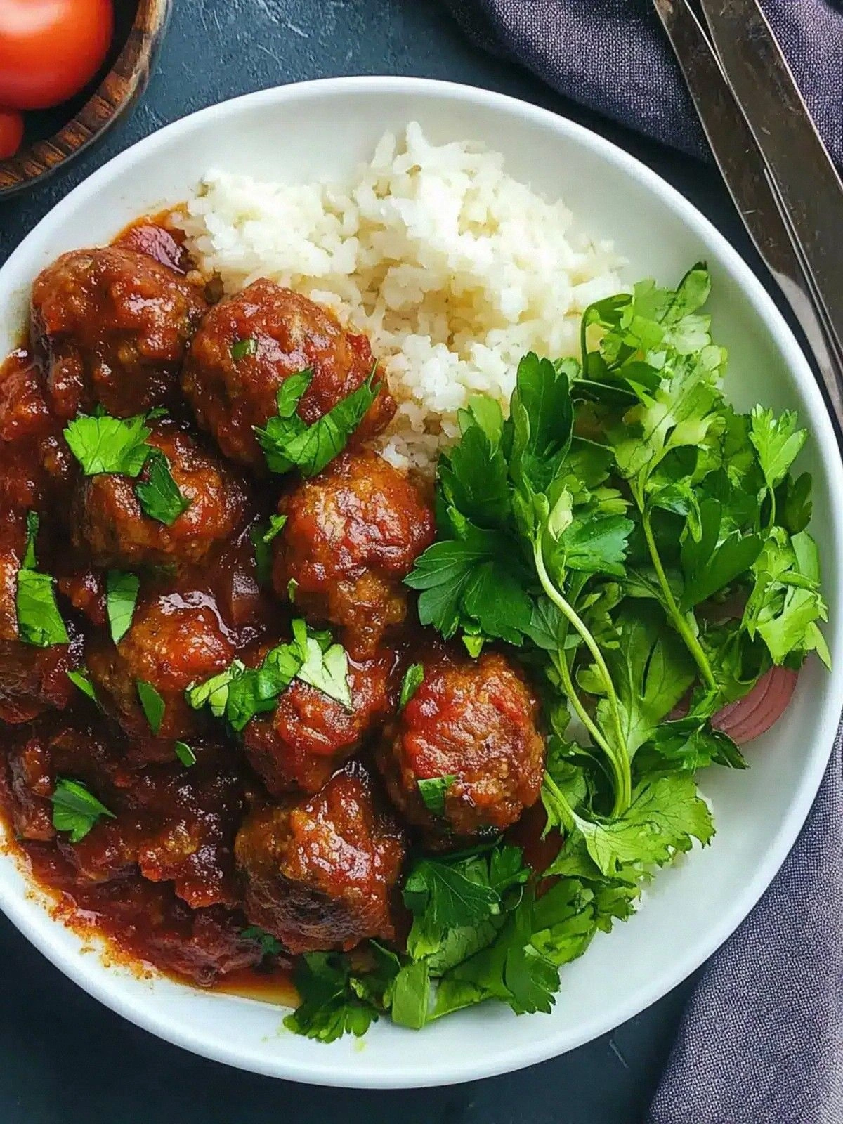 The sauce, a rich blend of diced tomatoes, tomato paste, beef stock, and a touch of sugar, coats the meatballs like velvet. The red onion adds sweetness and depth, while the garlic provides a punch of aroma. The bay leaf and ground cumin tie the flavors together, creating an umami‑rich base that’s comforting and complex. Finish with fresh parsley for a bright, herbal finish that cuts through the richness. Skipping the parsley will leave the dish feeling a little flat.